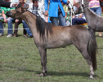 Arabian Elegance's color is red buckskin. She marries gracefulness and refinement with such strong points as a long and thin neck and a short back on extremely long legs.